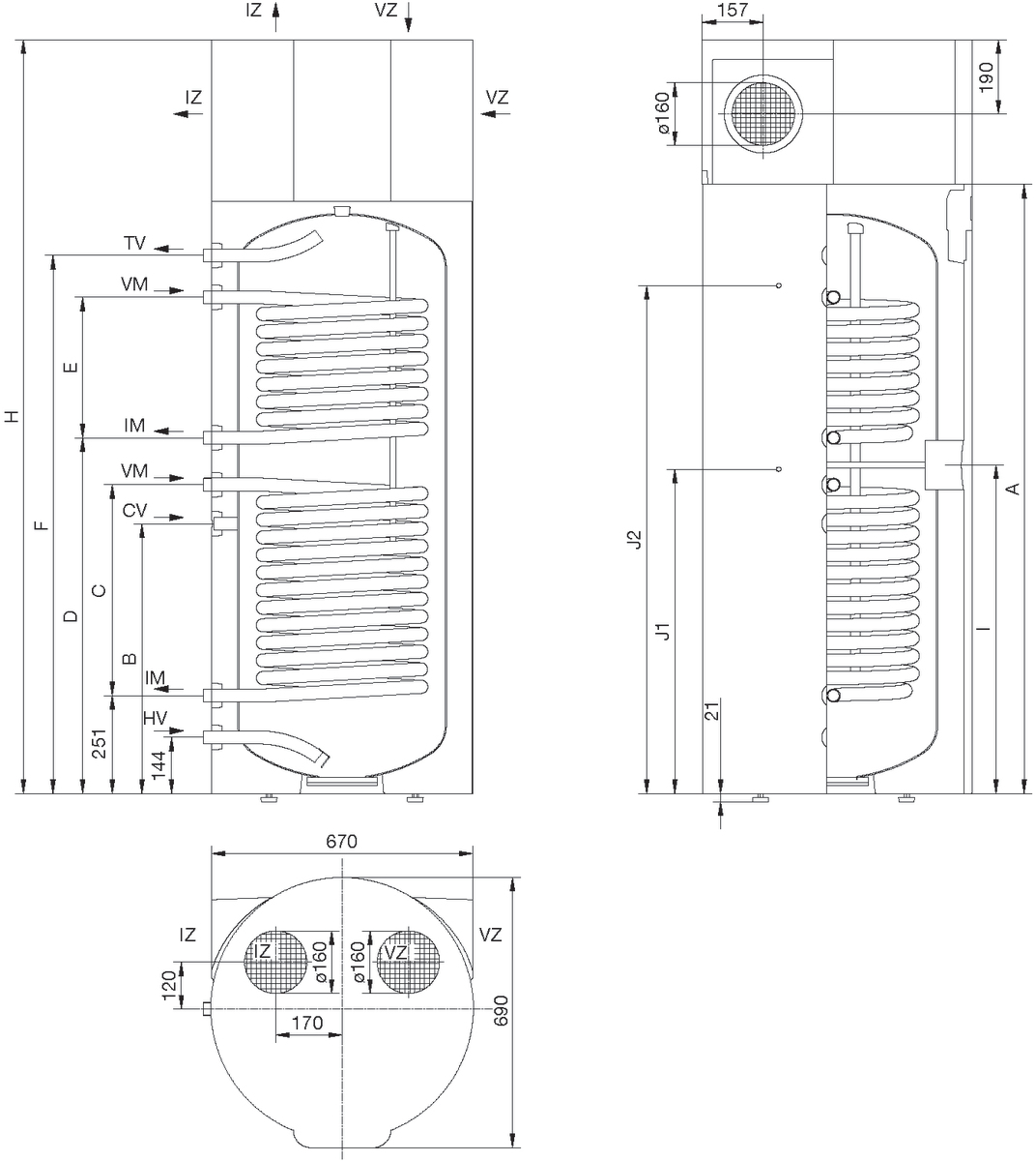 Integrated coil heat exchanger for connecting external heat sources such as heating boilers, furnaces, or solar collectors.