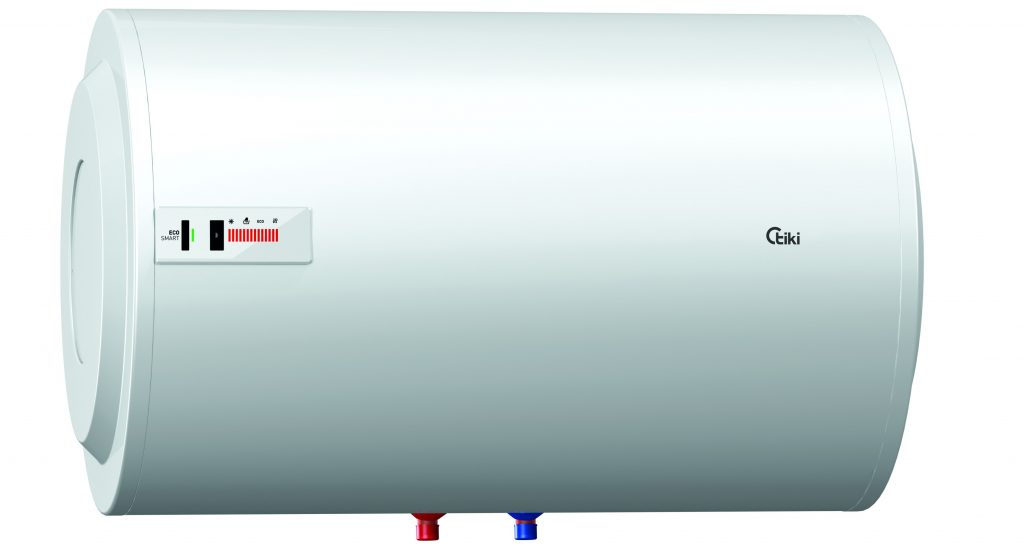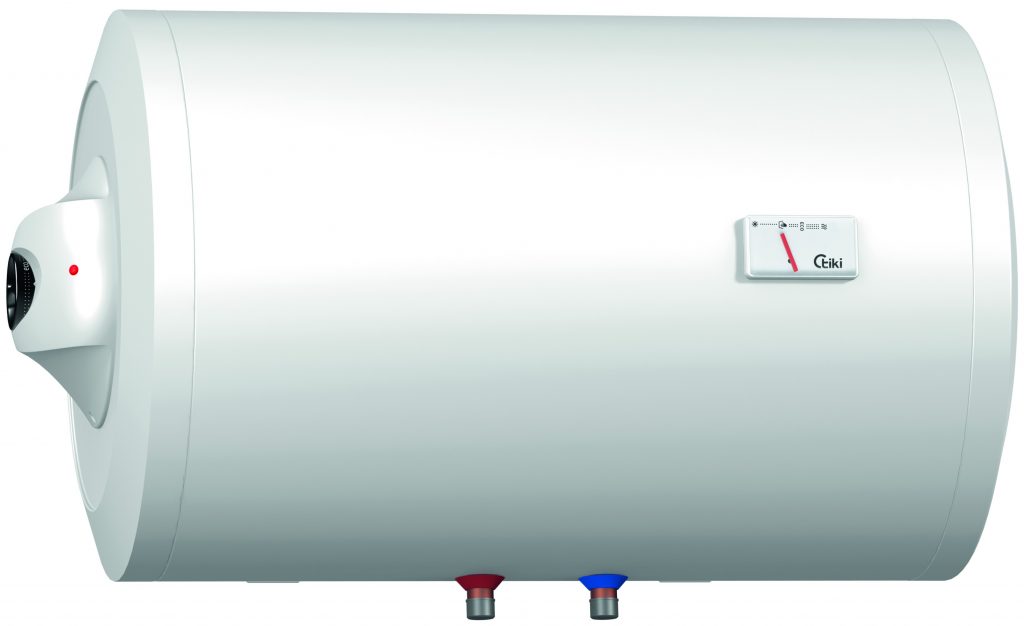 Horizontal electric water heater with external temperature regulation with a mechanical knob.